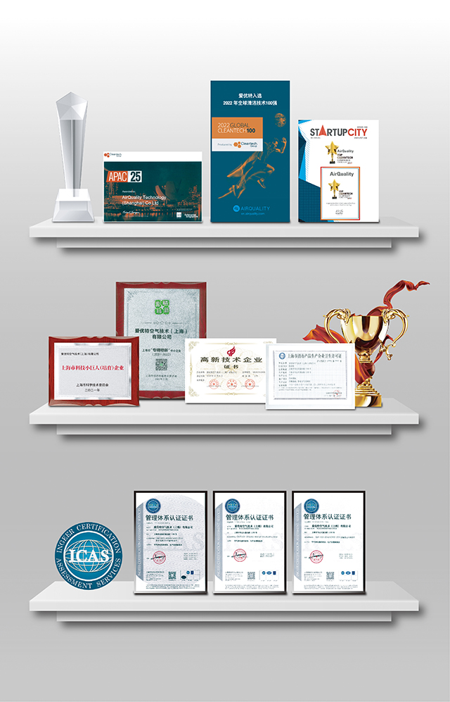 2019年爱优特成功入选了CleanTech亚太地区清洁技术公司25强,2020年被StartupCity评为亚太区清洁技术Top10企业, 2022年荣获全球清洁技术公司100强。此外,爱优特还具有ISO9001、ISO14001、ISO45001、消毒产品生产企业卫生许可证、高新技术企业、小巨人(培育)企业和专精特新等认证。