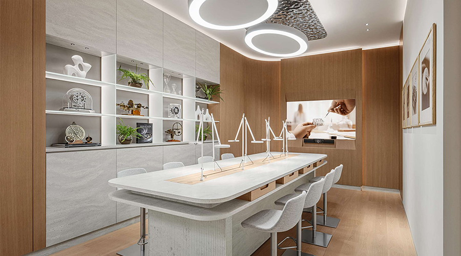 店内空间融合展示、体验与工艺传承,设有互动式机芯展示墙与专利技术展区,呈现品牌在制表历史与技术创新方面的成果。