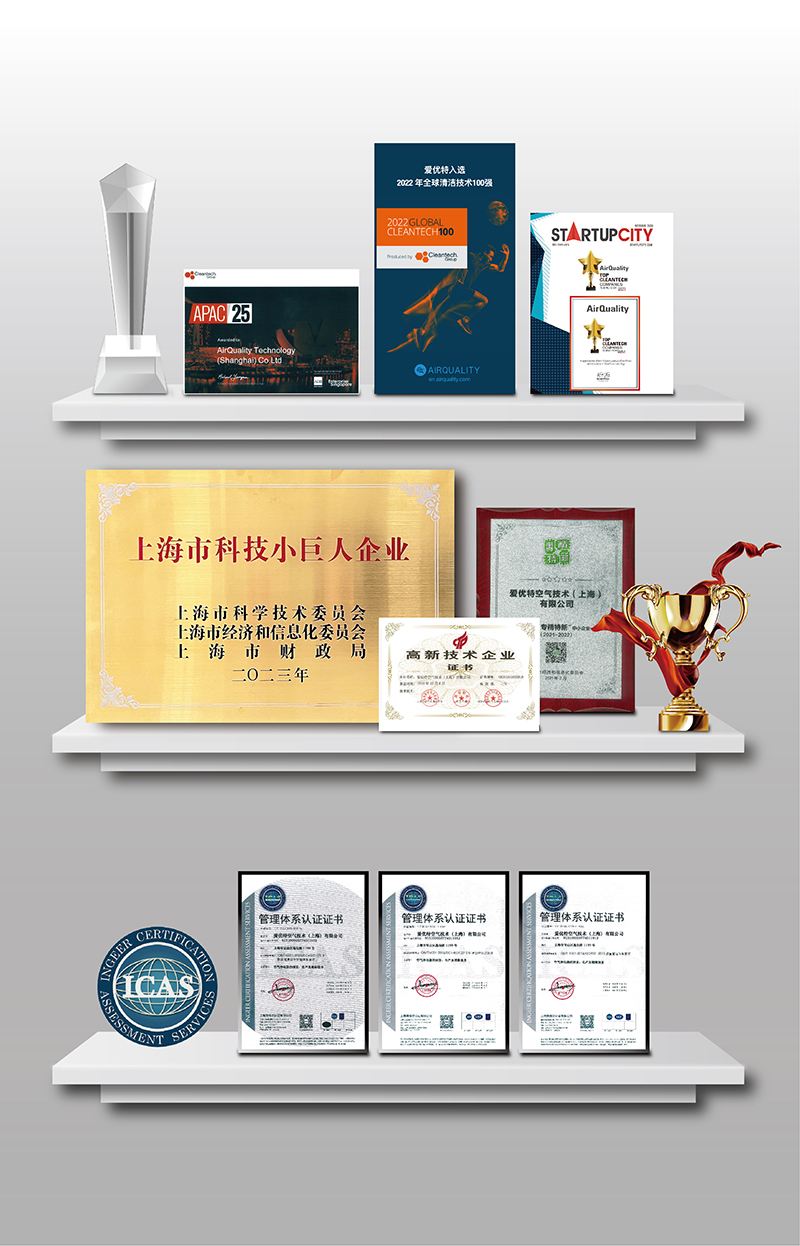目前,爱优特空气技术(上海)有限公司已拥有多项发明专利*,成为上海市高新技术企业、专精特新企业、科技小巨人企业。同时,公司还建有上海市专家工作站。在2022年,我们荣获了Cleantech Group评选的全球清洁技术Top100企业的殊荣。